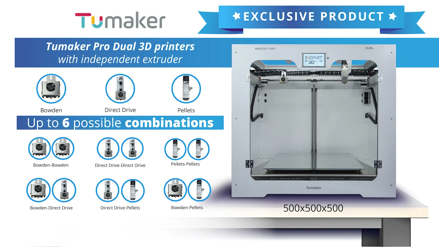 All these combinations are available in any of the four print volumes of the Tumaker range. The NX Pro Dual 3D printer and the three versions of the BIGFOOT: BF 200 Pro Dual, BF 350 Pro Dual y BF 500 Pro Dual.